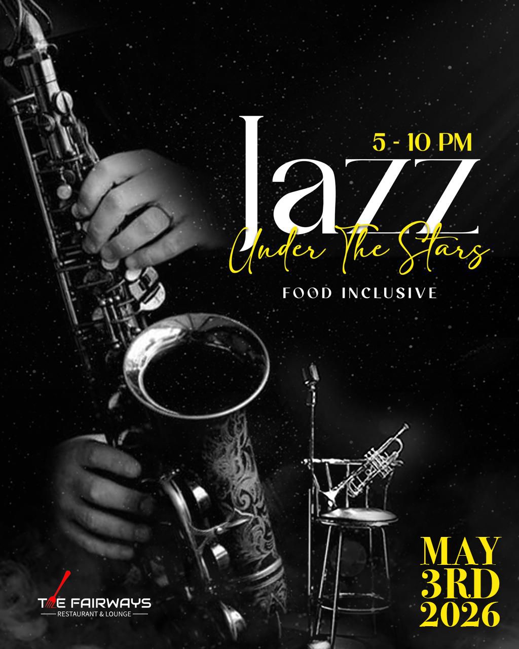 Join us on Sunday 3rd May, 2026 from 5PM–10PM at Fairways Restaurant & Lounge for a magical night filled with soulful jazz, great company, and a food-inclusive experience under the evening sky.